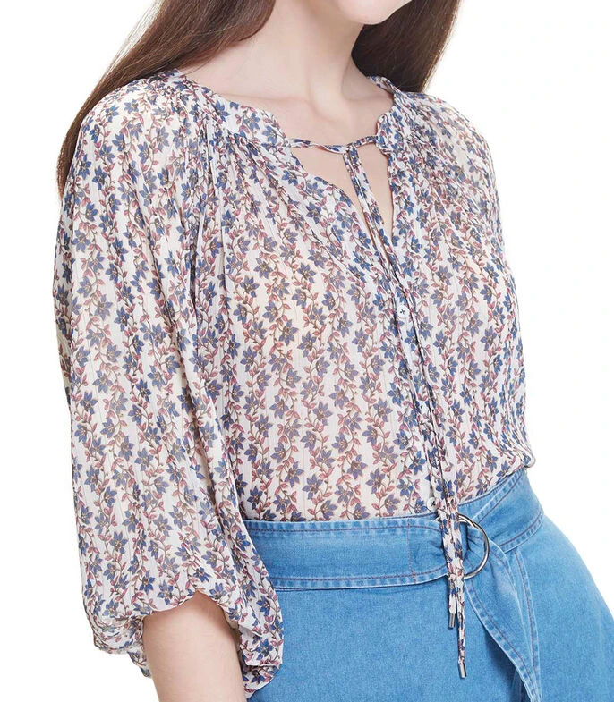 Blusa Julio de corte Regular en tejido de punto con estampado floral, manga abombada y lazo ajustable al cuello.