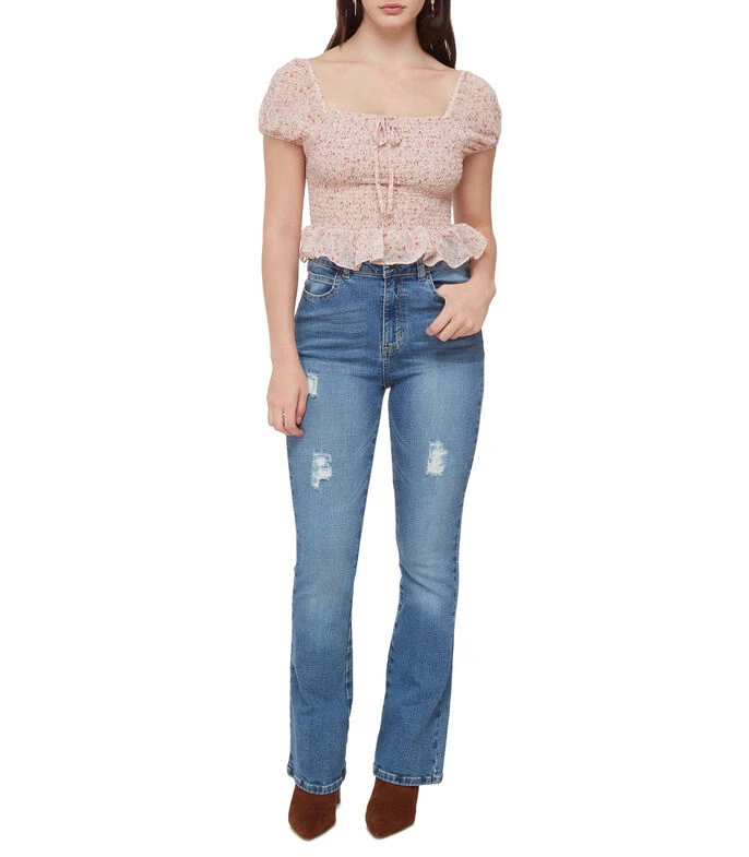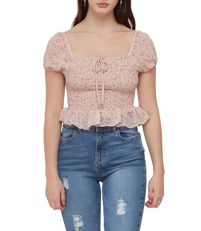 Blusa Catamaran de corte recto en tejido de punto, estampado floral, cintas en pecho y elástico al frente.
