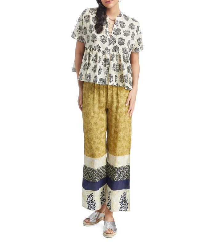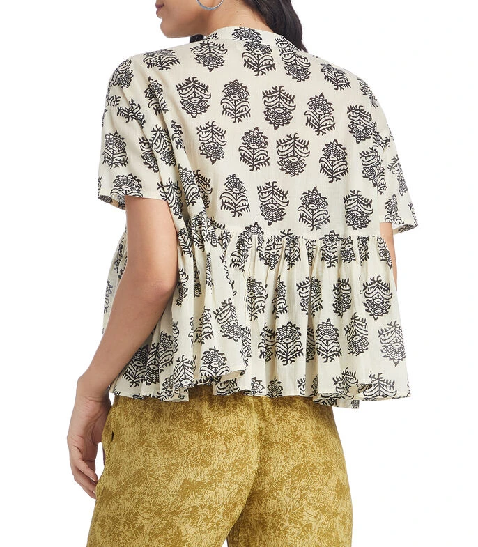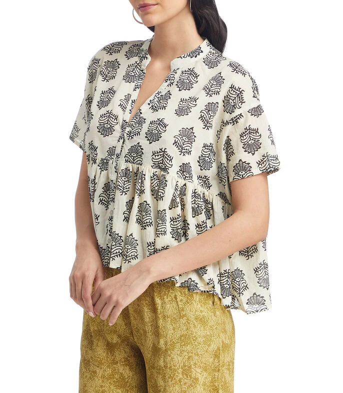Blusa Rapsodia de corte oversized en tejido plano con flores, cuello V, botonadura metálica a contraste y manga corta.