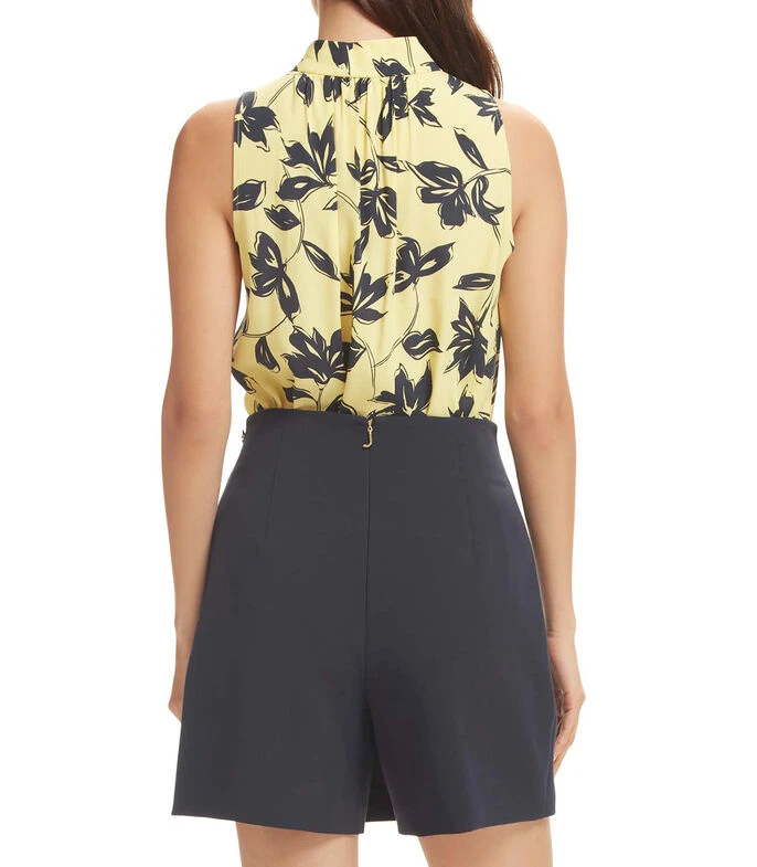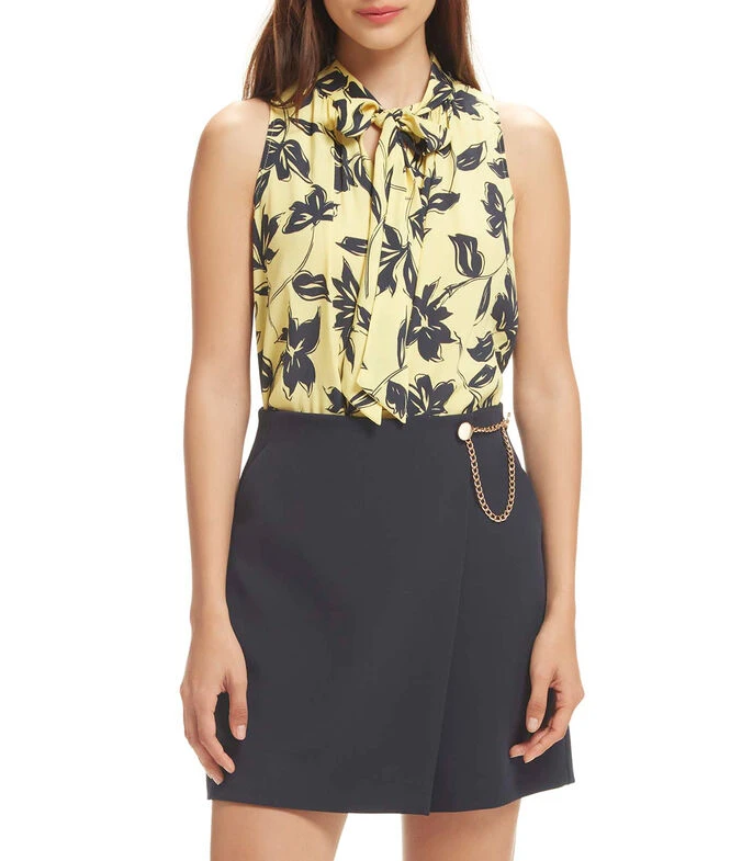 Blusa Julio de corte Regular en tejido de punto, estampado en crepé floral, corbata al cuello con abertura en «V» y fruncidos.