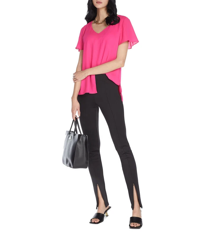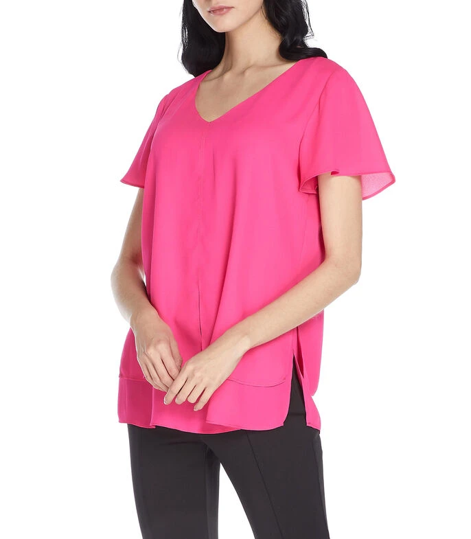 Blusa Frank Lyman de corte regular en tejido de punto con diseño liso, cuello V, manga corta y abertura decorativa a los costados.