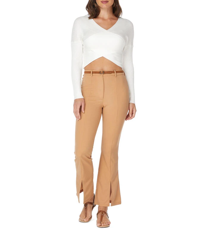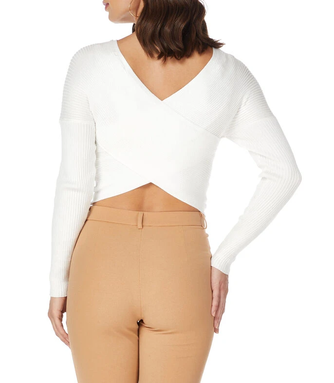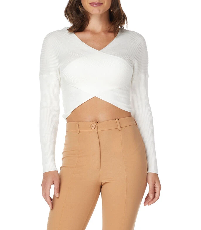 Blusa Epsilon de corte crop en tejido de punto acanalado, cuello V cruzado, manga 7/8 y borde bajo con cortes asimétricos.