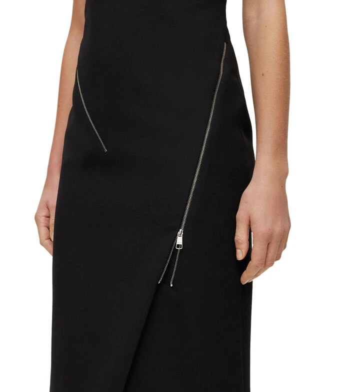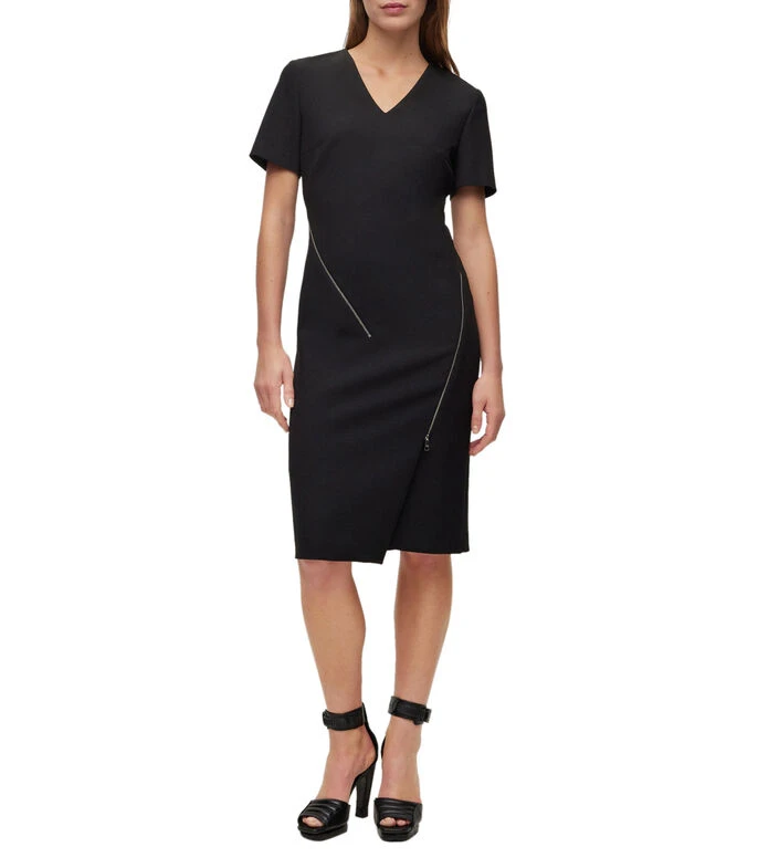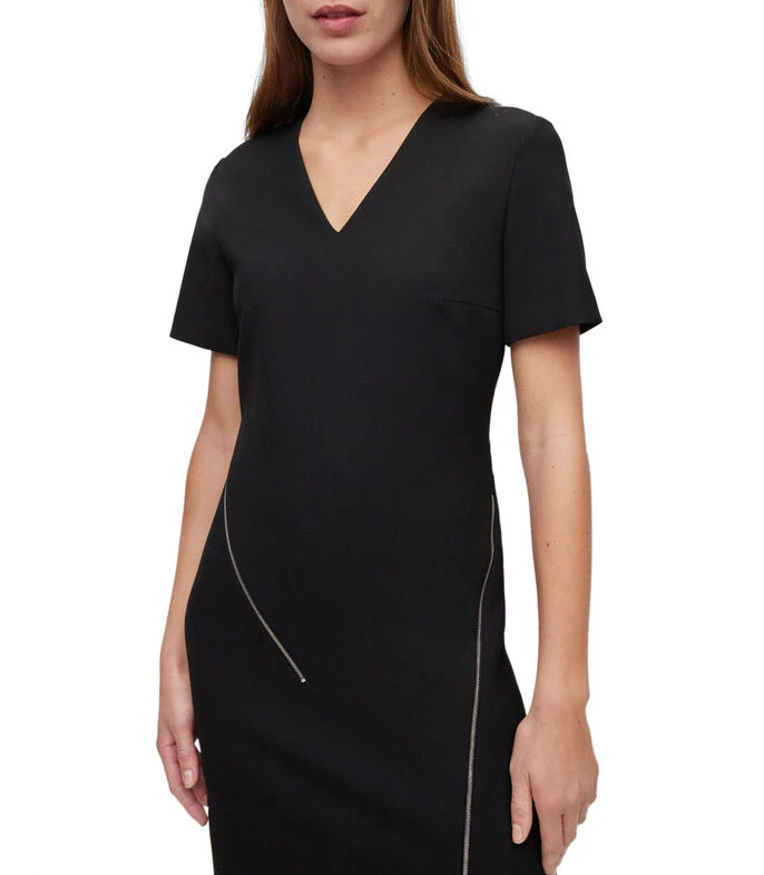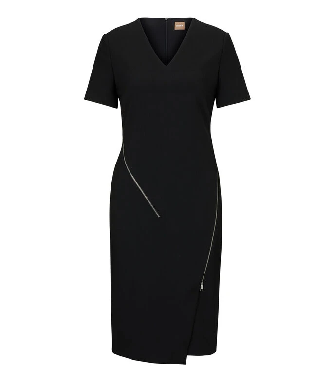 Un vestido slim fit Boss Mujer con escote en pico y detalles de cremallera a la vista. En nuestros productos Responsible siempre utilizamos como mínimo un 60% de materias primas más sustentables. Este producto está fabricado con fibras de celulosa certificadas a partir de madera natural sin tratar y procedente de bosques de gestión responsable. Cooperamos con organismos externos para que se respeten los bosques vírgenes y en peligro.