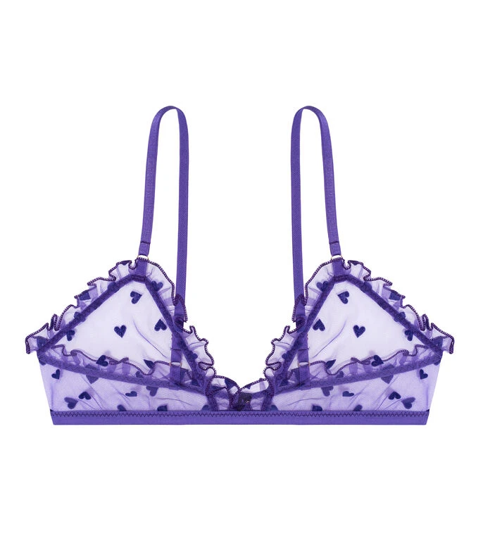 Bralette Le Petit Trou en tejido de punto transparente con corazones bordados, holanes en el borde del escote, tirantes ajustables y broche de ganchillos al reverso.