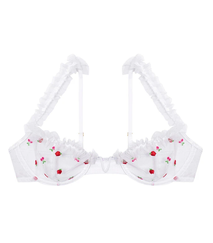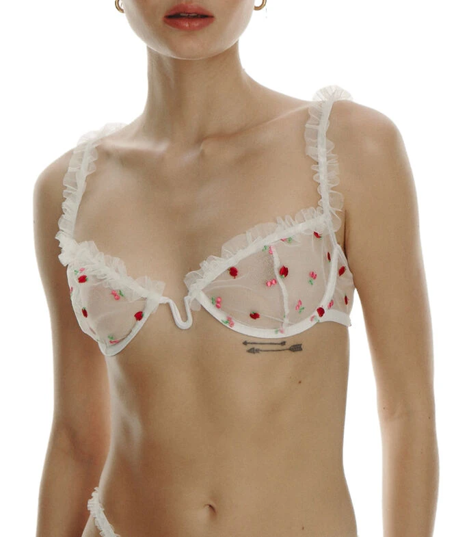 Brasier Le Petit Trou en tejido de punto semi transparente, detalle de malla, varilla en copa, detalle de cerezas y manzanas bordadas; tirantes ajustables con mini holanes y broche de ganchillos al reverso.