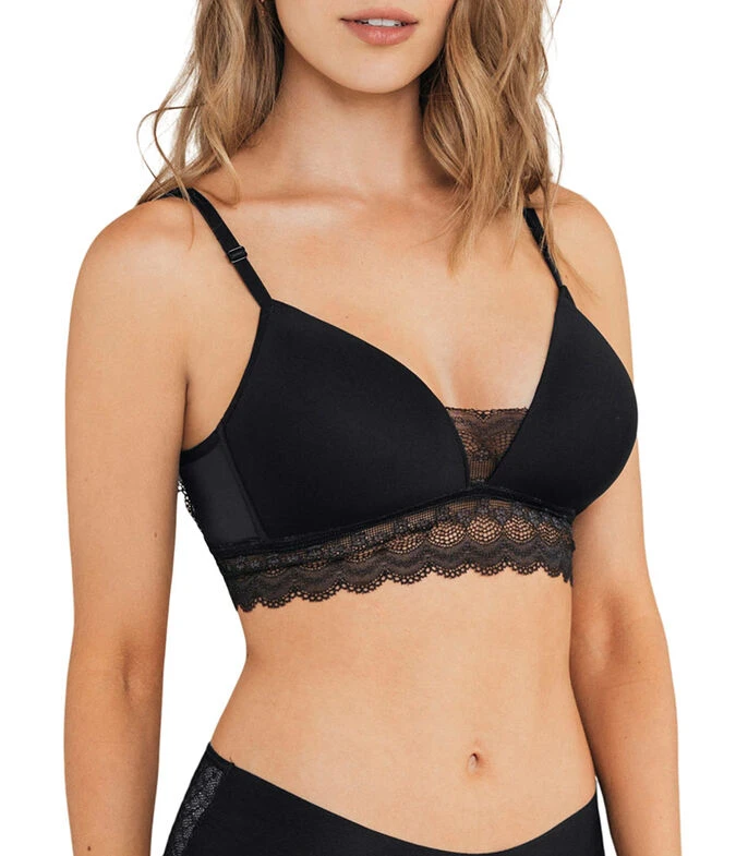 Brasier Leonisa con delicados toques de encaje, copa preformada suave, tirantes delgados regulables y broche en la espalda.