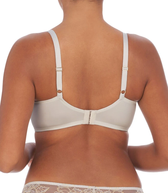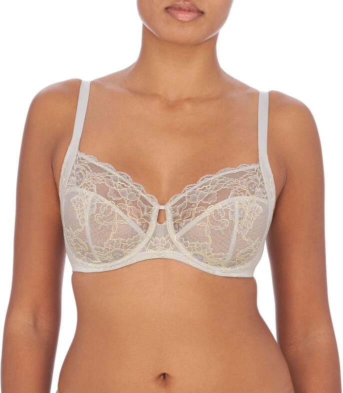Brasier Natori en tejido de punto con diseño liso, acabado de encaje, tirantes delgados ajustables, copas con varilla y broche en parte posterior.