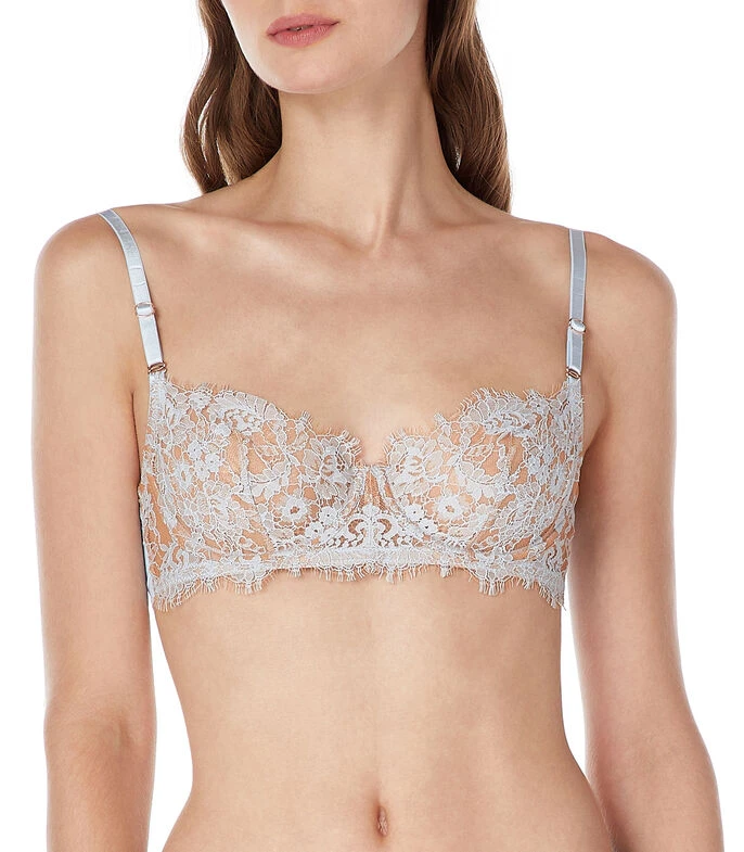 Brasier Skarlett Blue en tejido de punto semi transparente con acabado de encaje floral, varilla sobre copa, tirantes ajustables y broche al reverso.