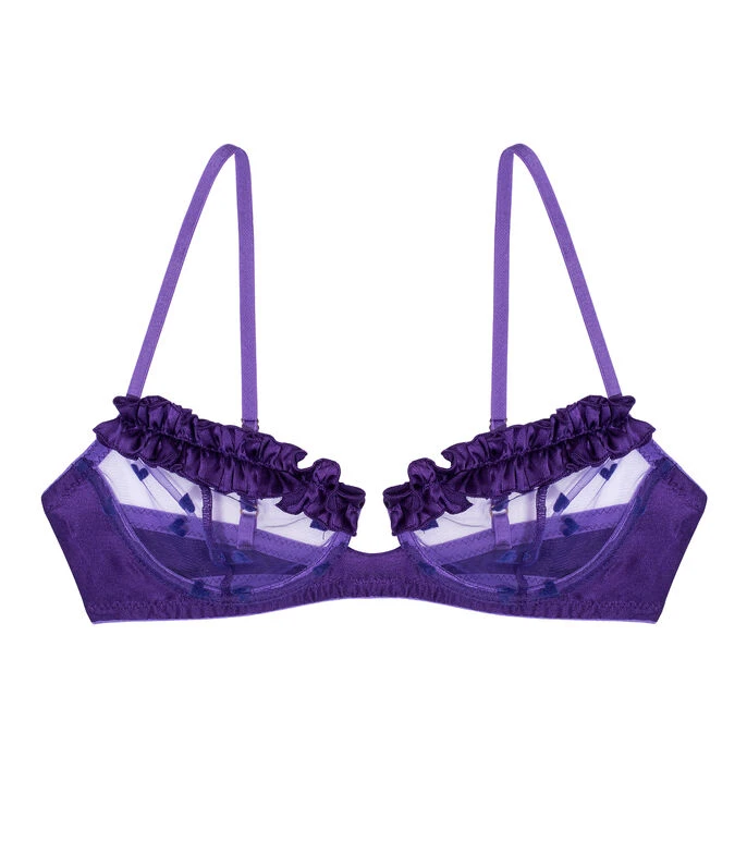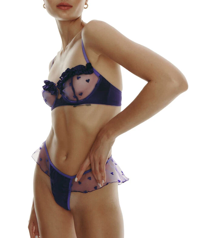 Brasier Le Petit Trou en tejido de punto transparente con corazones bordados, varilla en copa, holanes en el borde del escote, tirantes ajustables y broche de ganchillos en la espalda.