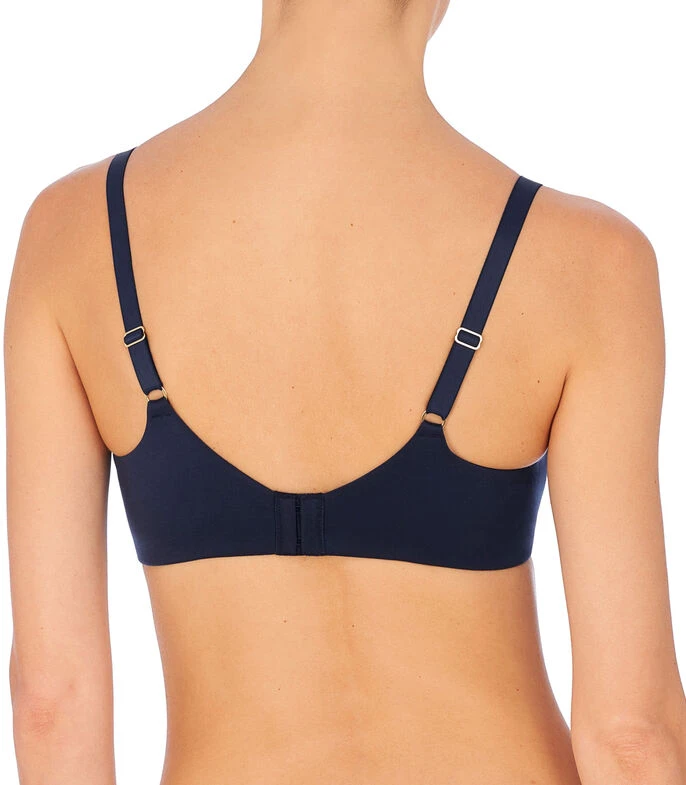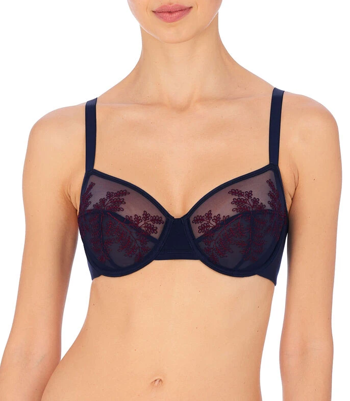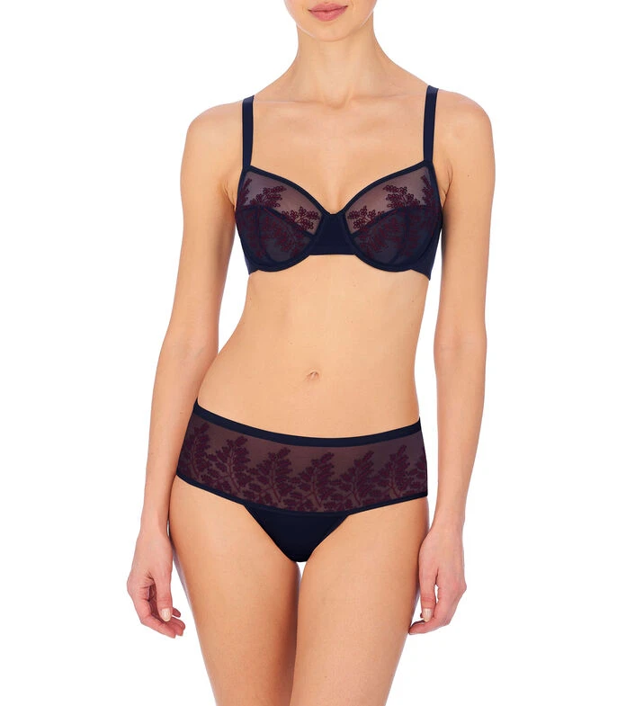 Brasier Natori en tejido de punto con semitransparencia, diseño decorativo de hojas, tirantes delgados y broche en espalda.