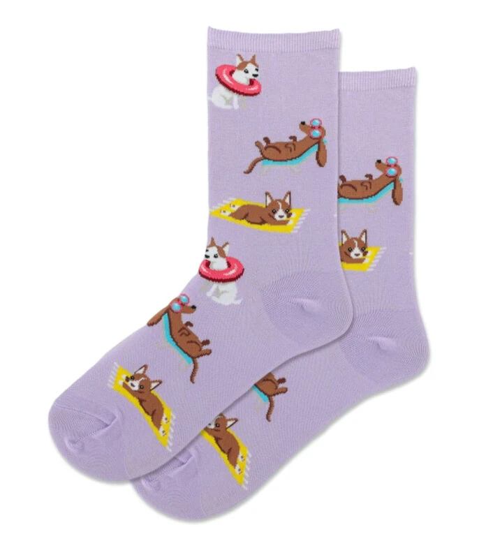 Calcetín Hot Sox en tejido de punto color morado con bordado de perros en la playa; Los días de playa con el mejor amigo de la mujer son los mejores. Con perros salchicha descansando y chihuahuas relajándose, estos calcetines son perfectos para los amantes de los perros. Sabemos que Sparky disfruta de la arena y el sol tanto como tú.