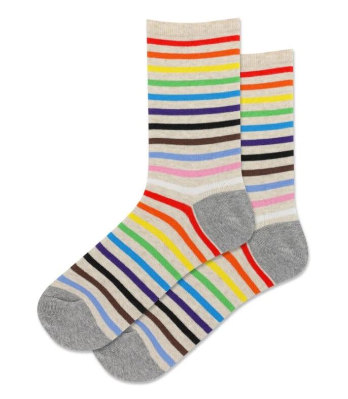 Calcetín Hot Sox en tejido de punto color beige con bordado de rayas a contraste; Siéntete ORGULLOSO de tu guardarropa y de quién eres con estos calcetines con rayas de arcoíris. Defiende el amor libre y la inclusión para todas las personas y estos calcetines son un guiño sutil a ese hecho.