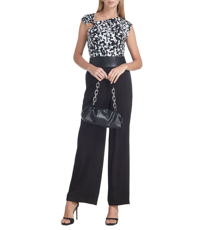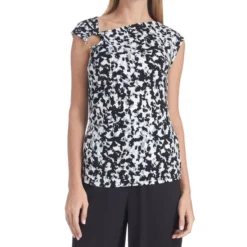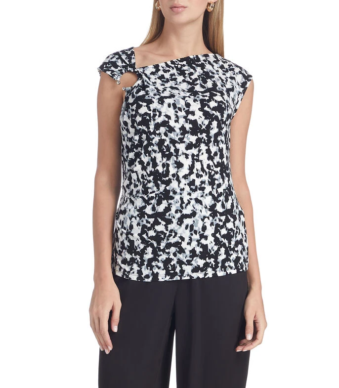 Blusa Calvin Klein de corte regular en tejido de punto con estampado abstracto, cuello asimétrico, detalle de pliegues y aro metálico decorativo en uno de los costados.