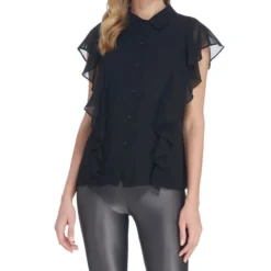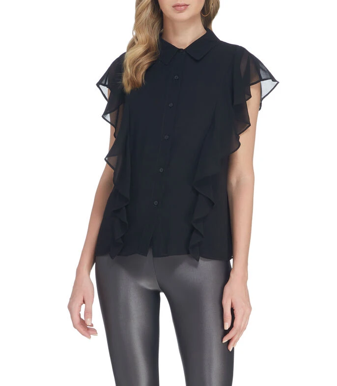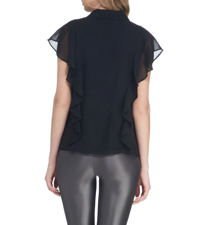 Blusa Calvin Klein de corte regular en tejido de punto con cuello camisero, aplicación de olanes semitransparentes y cierre frontal de botones.