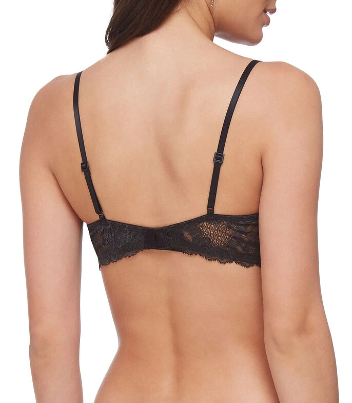 Brasier Calvin Klein en tejido plano, diseño de encaje, copa con varilla, moño al frente, tirantes ajustables y broche en espalda.