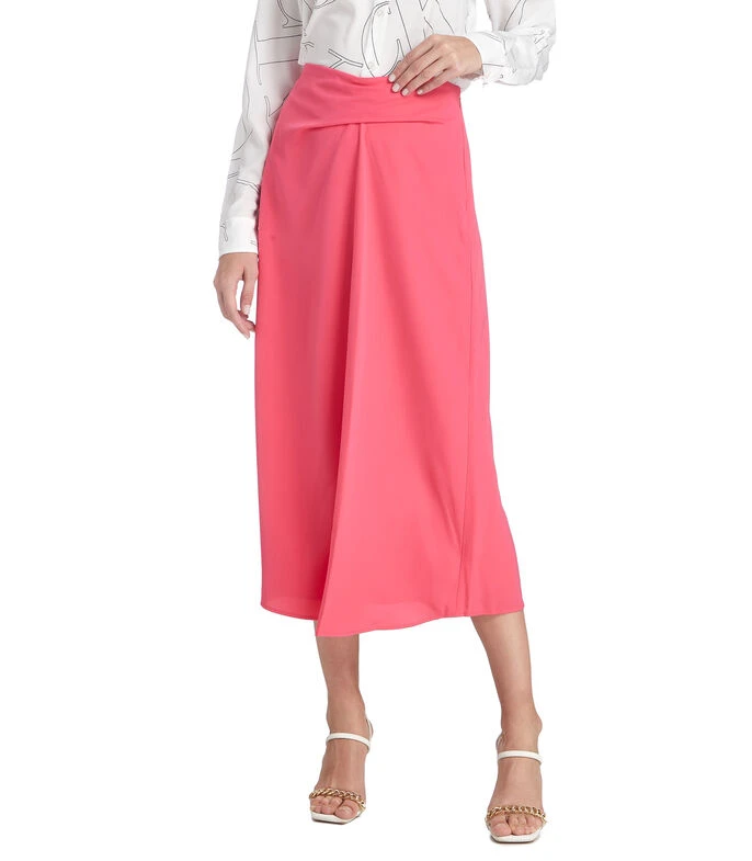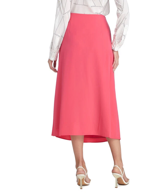 Falda Calvin Klein de corte A en tejido plano, diseño sólido, detalle de pliegue en cintura y cremallera en posterior.