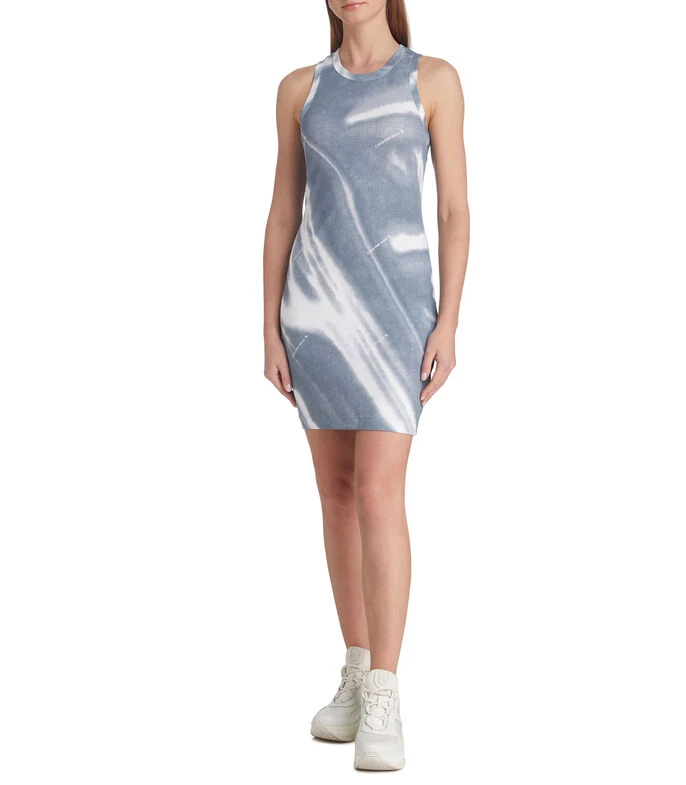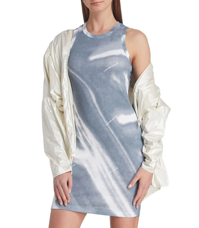 Vestido Calvin Klein Jeans Mini, de corte Slim en tejido de punto con diseño Tie Dye, cuello redondo, sin mangas y bordes acanalados.