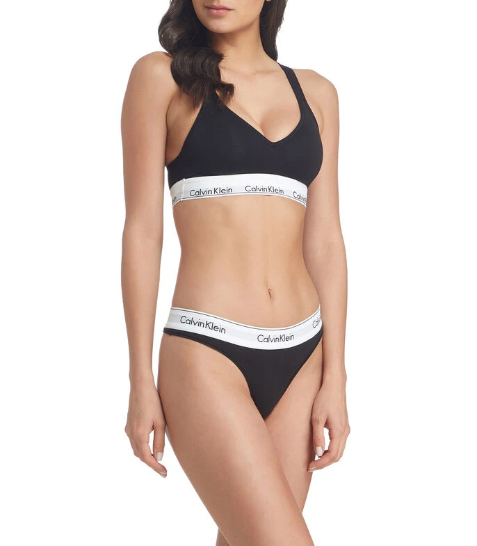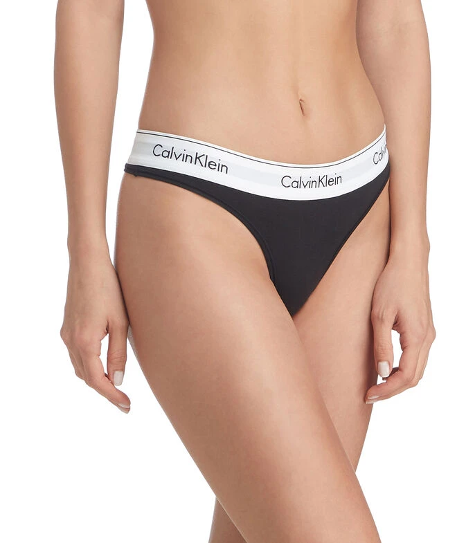 Tanga Calvin Klein en tejido de punto liso, pretina elástica y detalle de la marca.