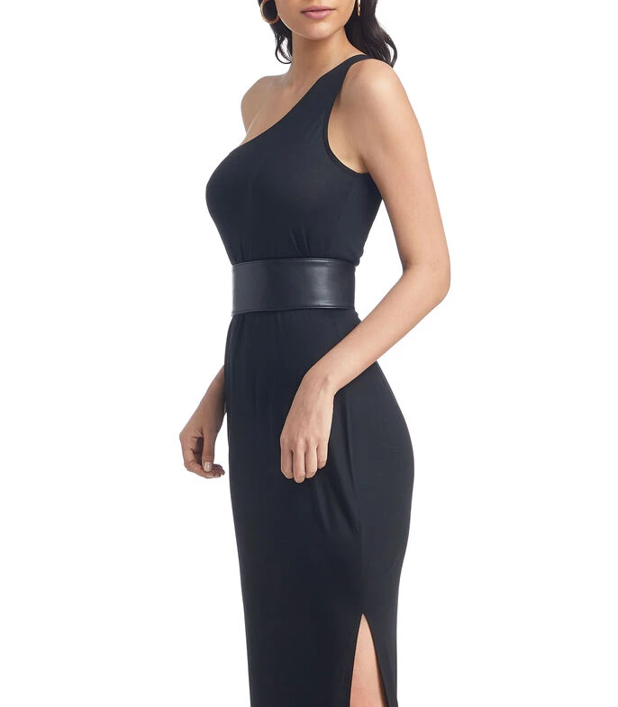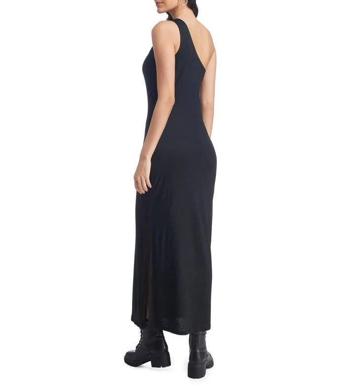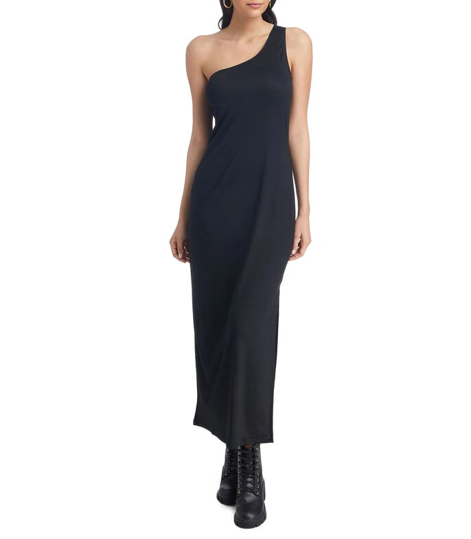 Vestido Calvin Klein maxi de corte recto en tejido de punto, diseño sólido, cuello asimétrico, con tirante ancho y abertura lateral en parte inferior.