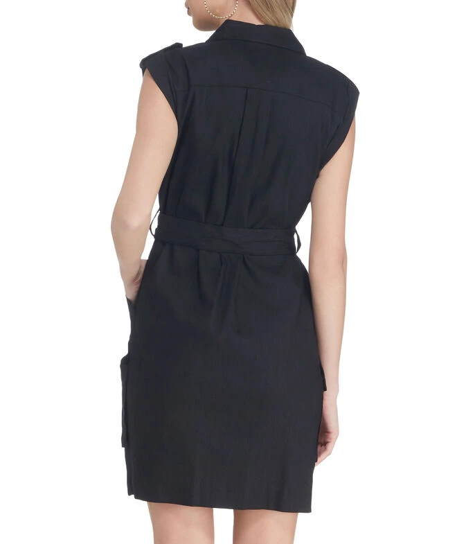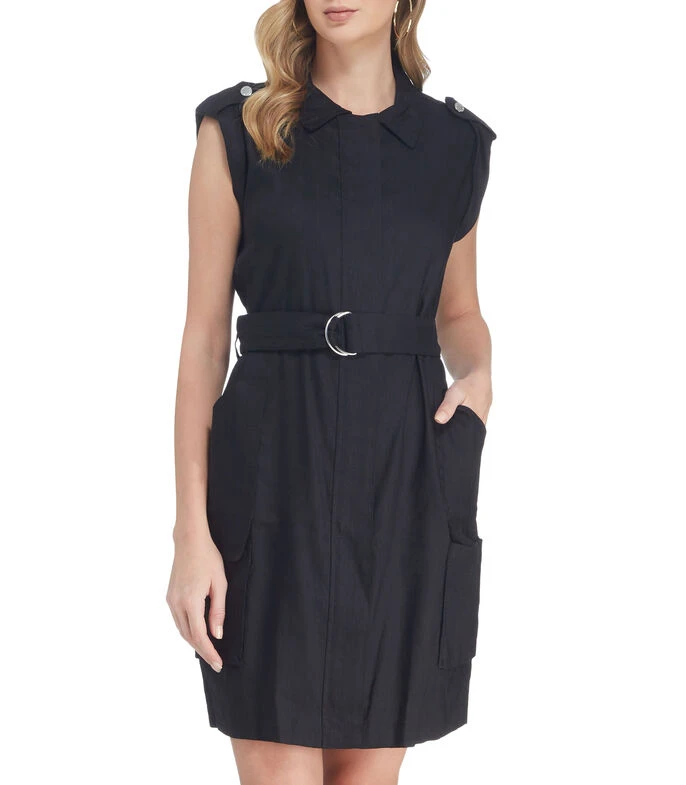 Vestido mini Calvin Klein tipo camisero de corte recto en tejido de punto con cintas en hombros, bolsillos laterales, lazo de amarre en cintura y cierre frontal de cremallera.