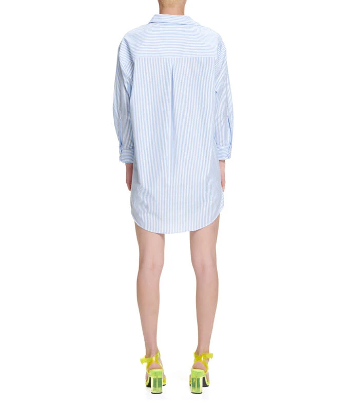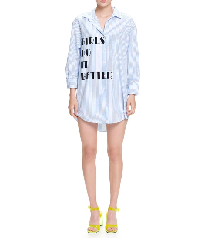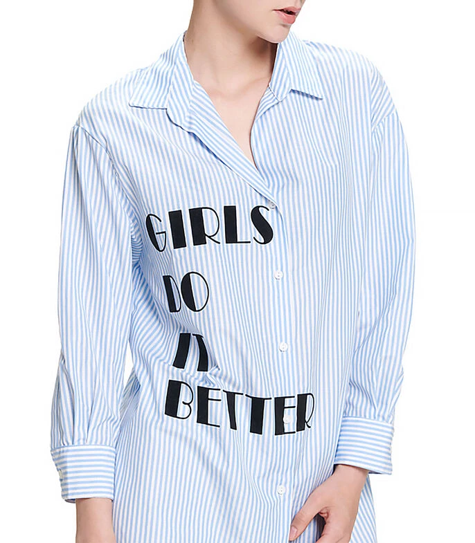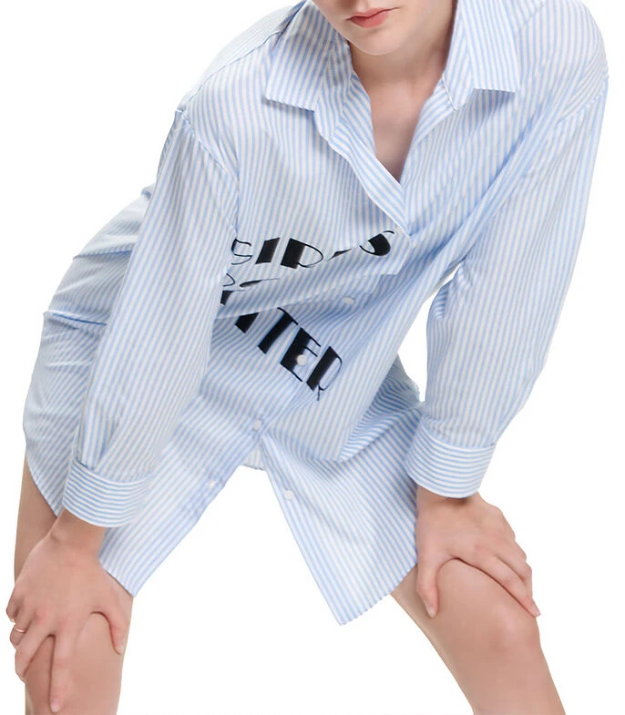 Camisa Unfollow oversized en popelina de rayas. Estampado frontal en contraste con textura terciopelo. Manga larga. Ruedo en desnivel.