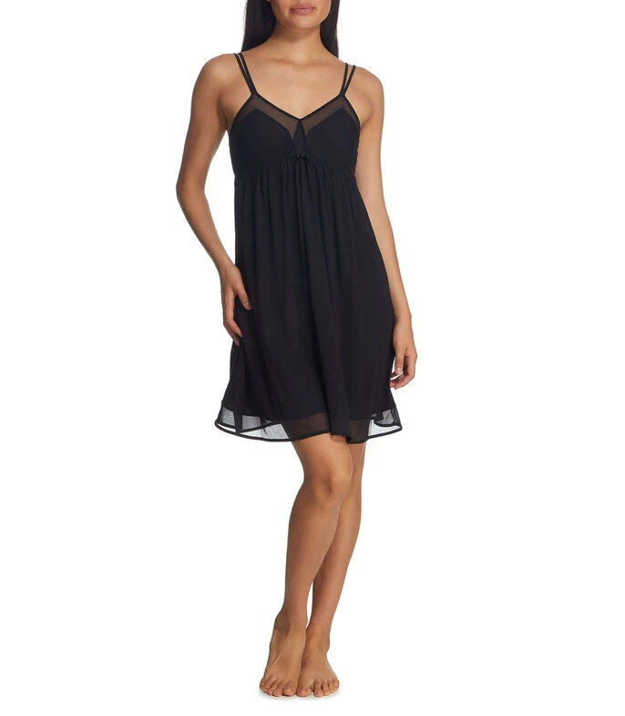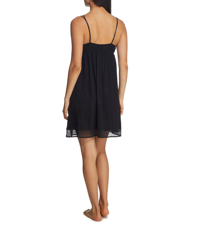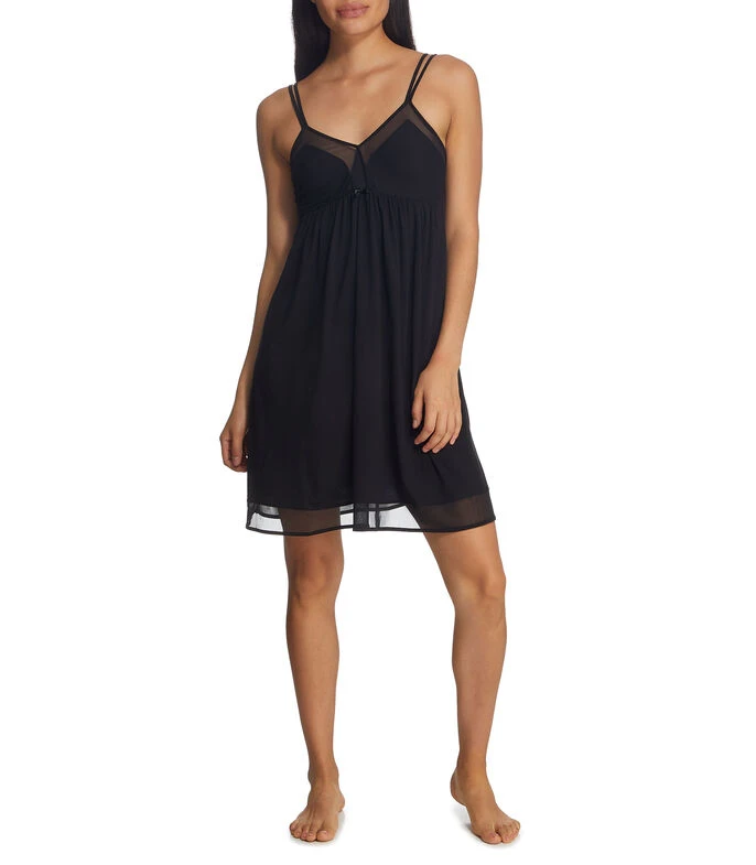 Camisón UNWIND by Epsilon de corte regular en tejido de punto, cuello V con aplicación de mesh, sin mangas, tirantes delgados ajustables y elástico posterior.