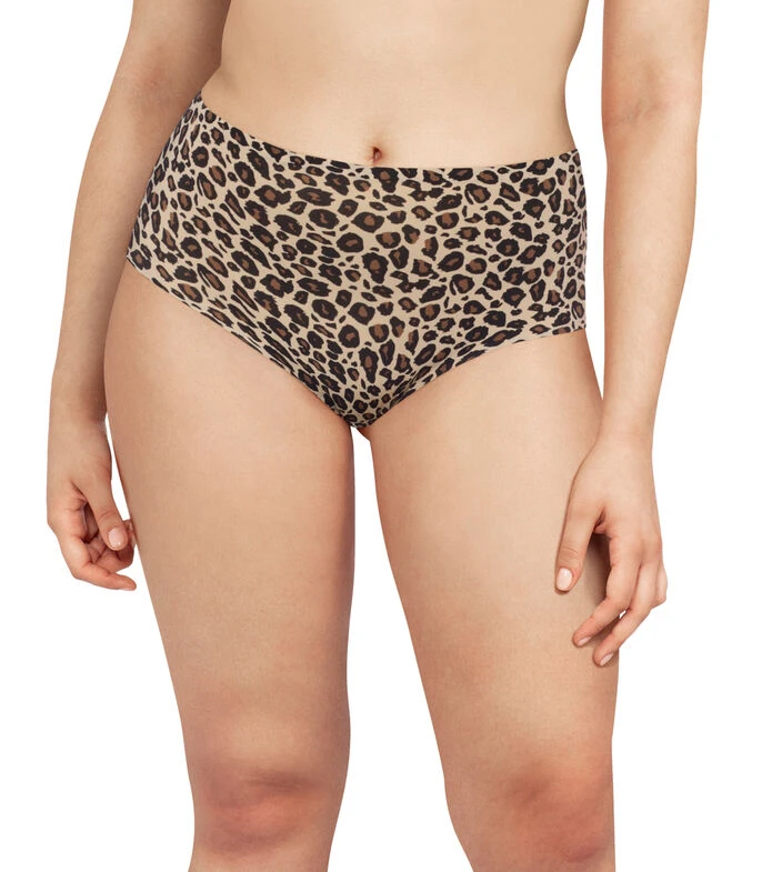 Bikini Chantelle alto en tejido de punto con estampado animal print sin costuras. Revolucionaria malla que se adapta a cualquier morfología, es cómoda, ultra suave y ligera. Puente: 100% Algodón. Efecto de segunda piel y con invisibilidad.