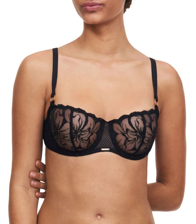Brasier Chantelle en tejido plano semitransparente, diseño floral de tul bordado, copa con varilla, efecto de realce, tirantes ajustables y broche en espalda. Ideal para escotes cuadrados.