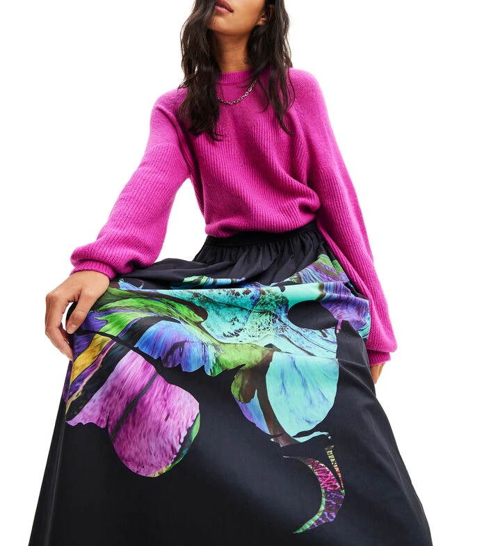 Falda larga Desigual Globule Lacroix de corte A en tejido de punto con estampado frontal multicolor y pretina elástica; Diseñada por M. Christian Lacroix.