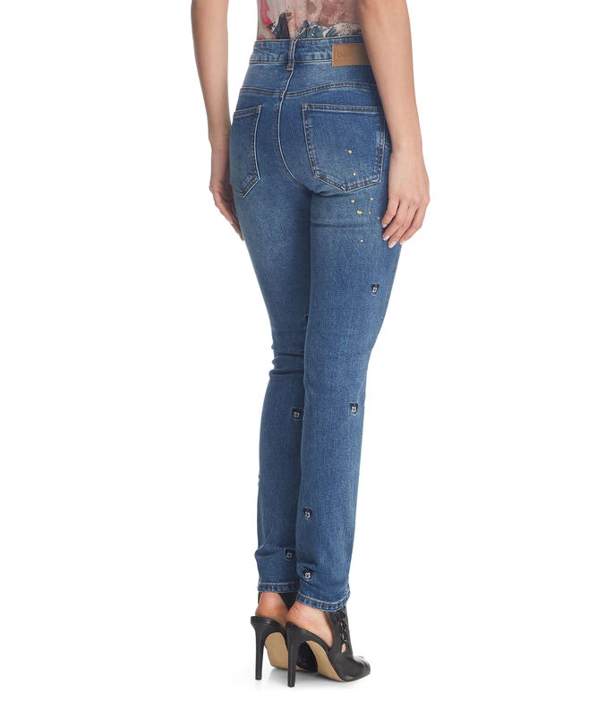 Jeans Desigual Mickey de corte skinny con sutil diseño deslavado, bordado alusivo al modelo en cuerpo, trabillas para cinturón, cierre de cremallera con botón metalizado y pespuntes a contraste.