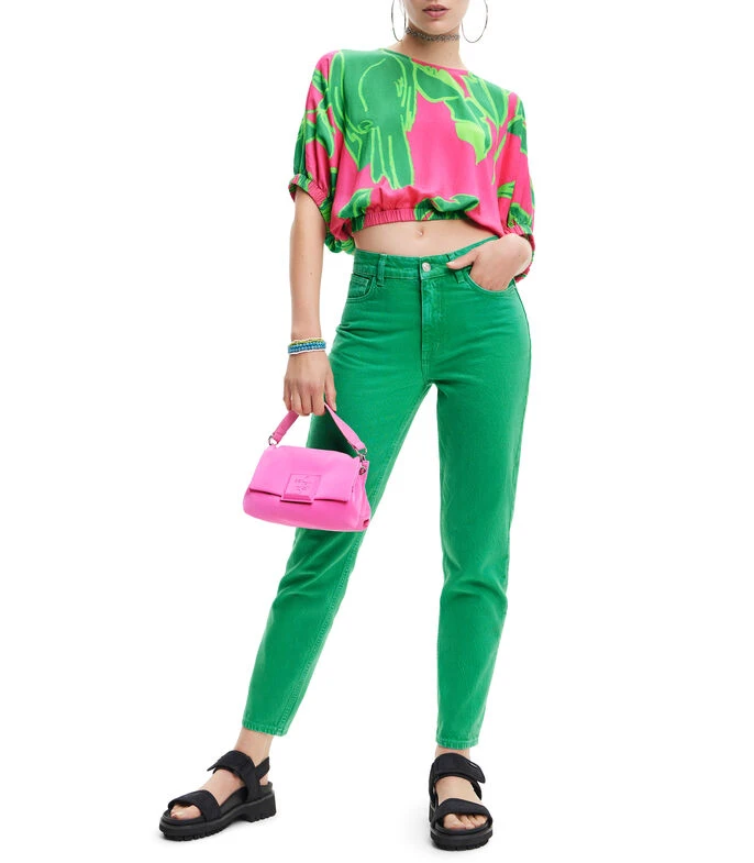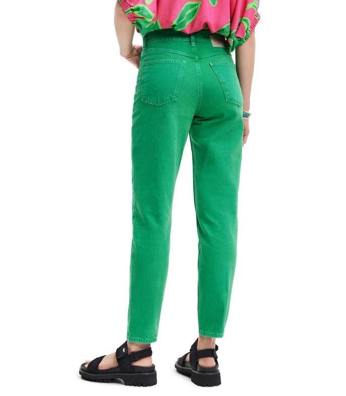 Jeans Desigual de corte mom fit con trabillas, corazón bordado, parche en posterior, botón logotipado y cierre de cremallera.