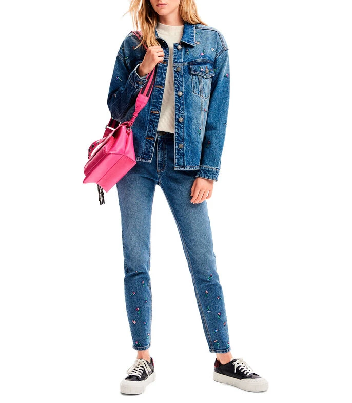 Jeans Desigual Viena de corte slim con diseño ligeramente deslavado, pespuntes a contraste, remaches metálicos y pequeñas flores bordadas en parte inferior.