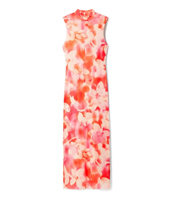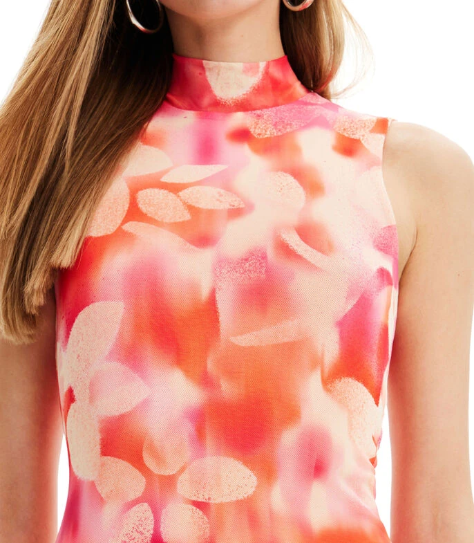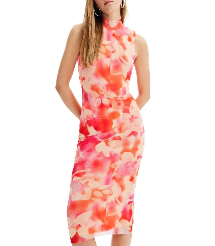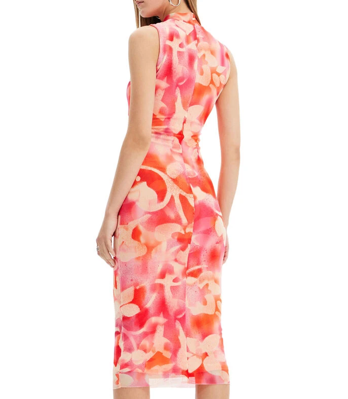 Vestido Desigual Midi de corte ajustado en tejido de punto con estampado floral efecto pintura, cuello alto y sin mangas.