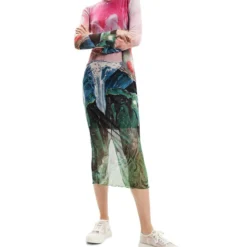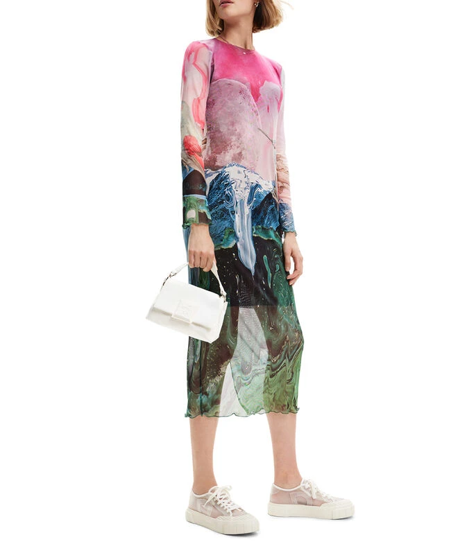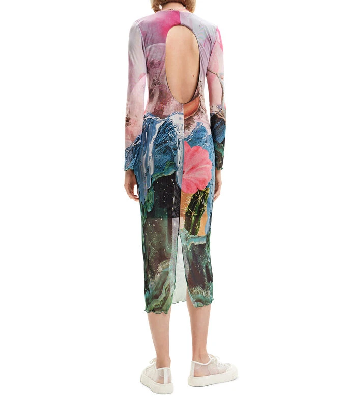 Vestido midi Desigual de corte ajustado en tejido de punto tipo tul con estampado fantasía multicolor, abertura en espalda y parte inferior translúcida.
