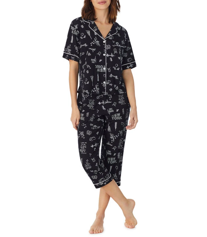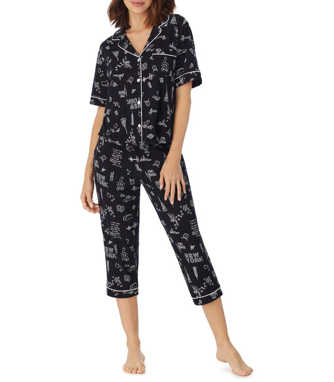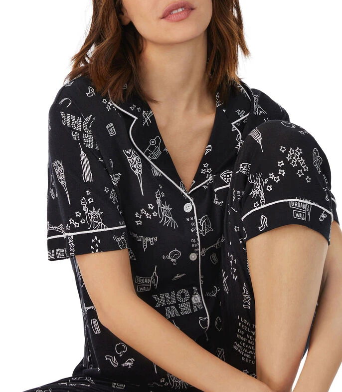 Pijama DKNY de 2 piezas Cami novelty con camisa de corte regular en tejido de punto con estampado alusivo al modelo a contraste, cuello camisero, manga corta y botonadura a contraste. Pantalón tipo capri con pretina elástica.