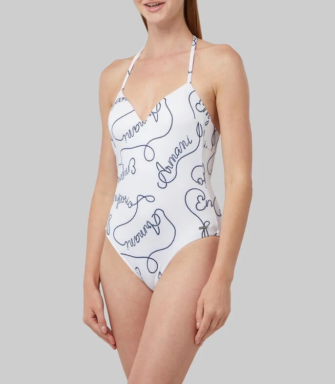 Maillot Emporio Armani en tejido plano, cuello halter, cinta anudable en nuca, copas suaves integradas, estampado a contraste con el nombre de la marca, detalle metálico en costado, cierre de nudo en espalda y escote.