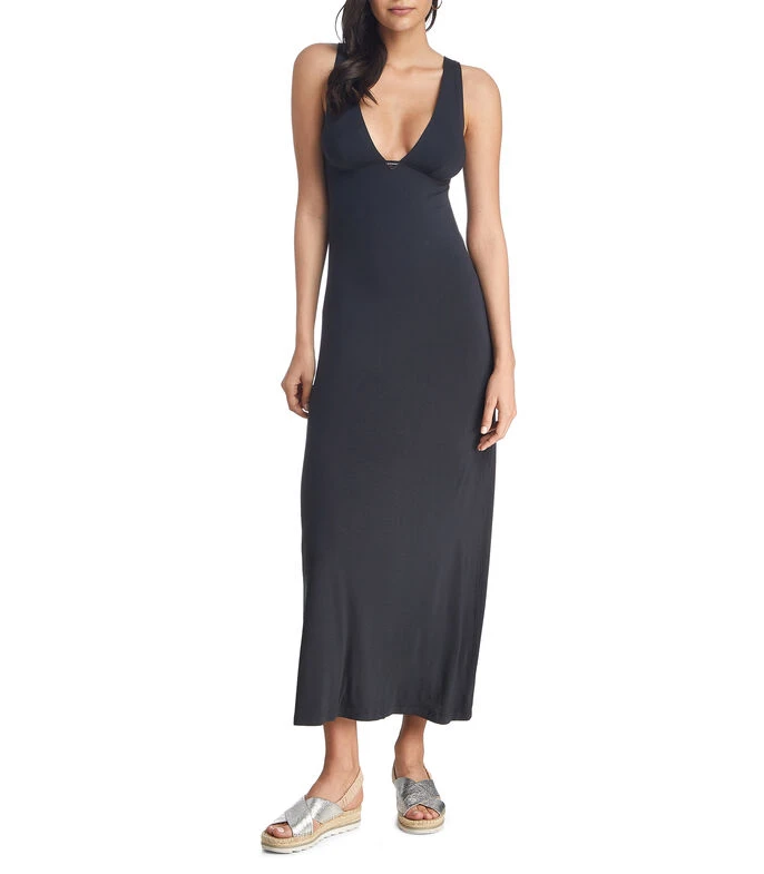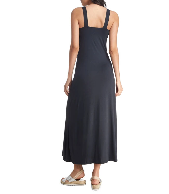 Vestido Emporio Armani midi, de corte recto en tejido de punto, cuello V con detalle metálico con el nombre de la marca al centro y tirantes delgados.