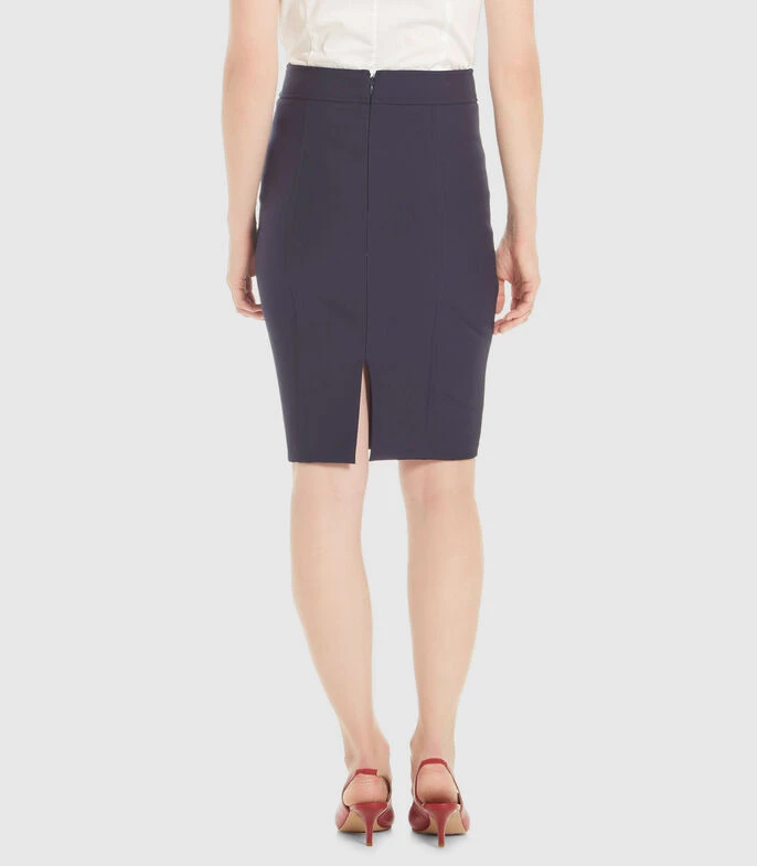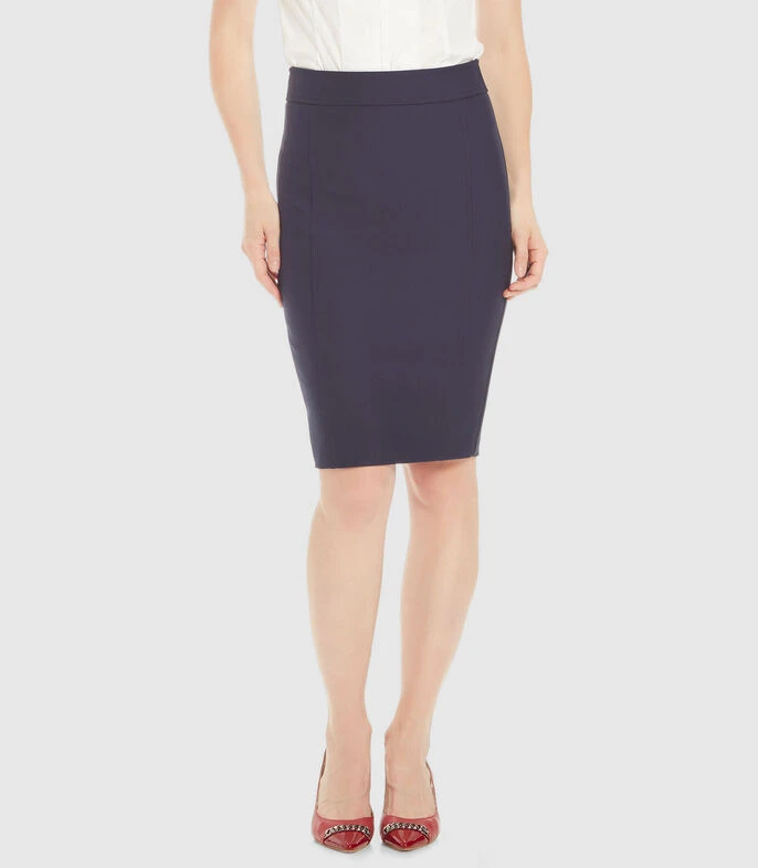 Falda midi Julio de corte recto en tejido de punto, acabado liso, detalle de líneas de quiebre, cremallera en parte trasera y abertura decorativa.