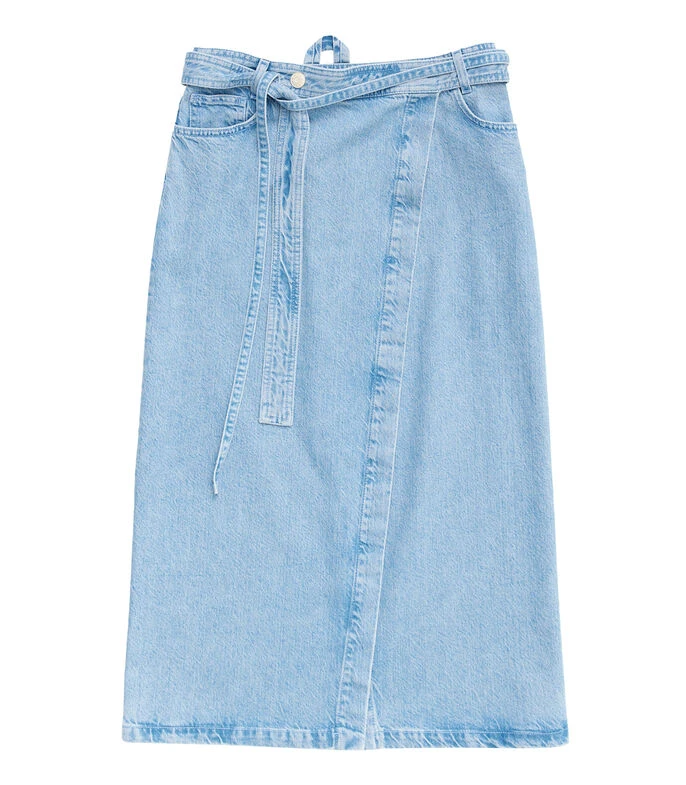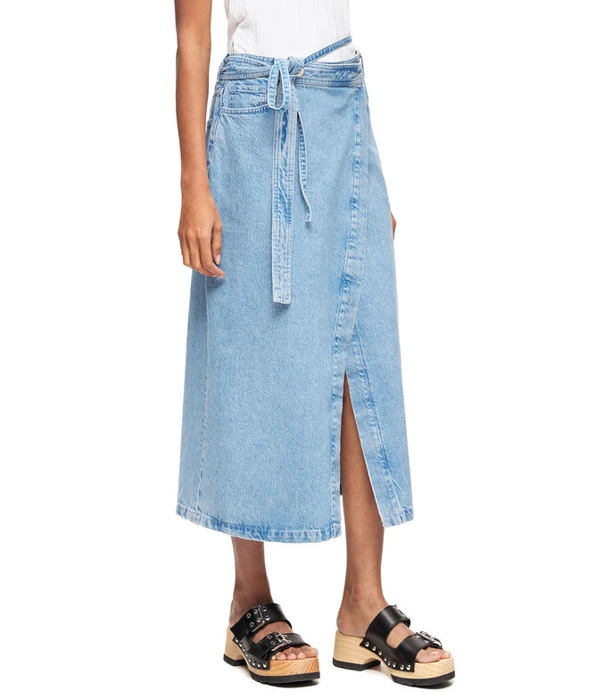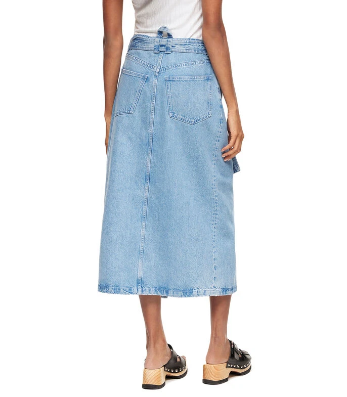 Falda midi Bimba y Lola de corte recto en mezclilla, diseño tipo pareo, bolsillos al frente, botón metálico y cinta de ajuste.