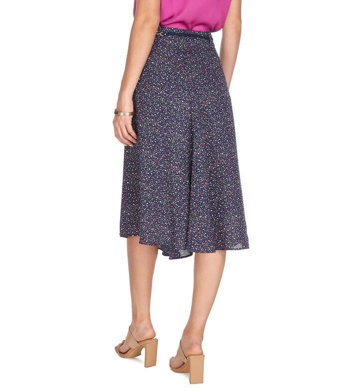 Falda midi Pertegaz de corte recto en tejido de punto con estampado multicolor irregular, cierre oculto sobre costado y cinturón decorativo.