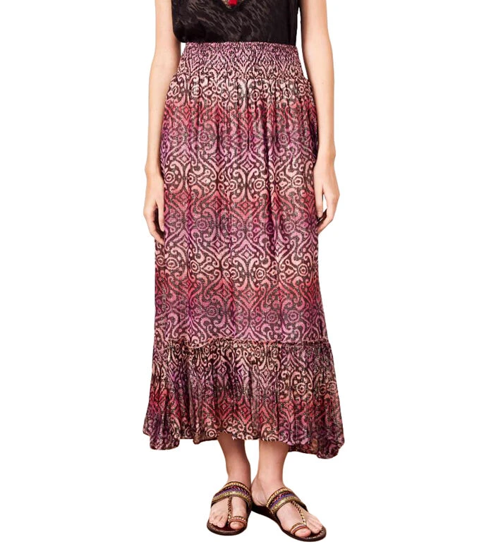 Falda Midi Rapsodia de corte «A» en tejido de punto con estampado fantasía, pretina elástica e inserción de hilo metalizado. Una prenda relajada y despreocupada, ideal para outfits de verano.