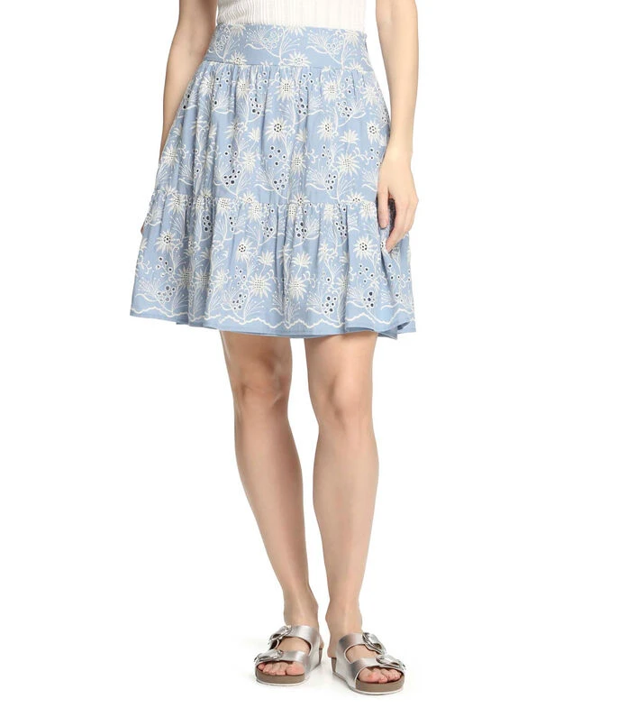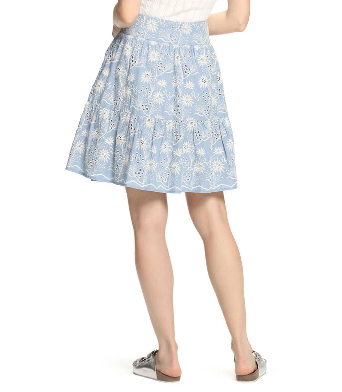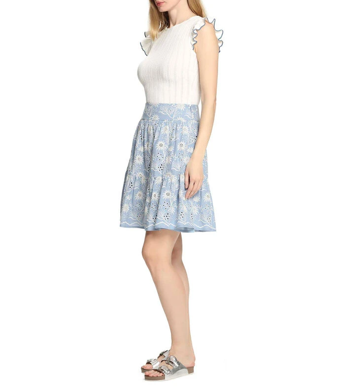 Falda midi Julio de corte «A» en tejido de punto con flores, aberturas decorativas y cremallera en costado.