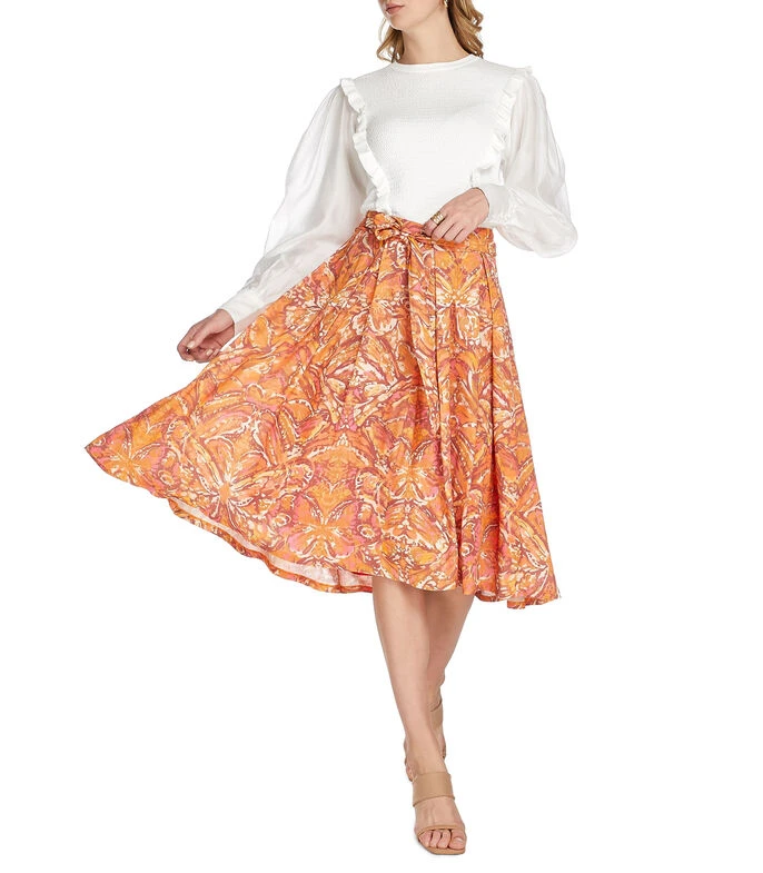 Falda Midi Chester & Peck de corte A en tejido de punto con estampado alusivo al modelo, cinta en cintura y medio cierre de cremallera en lateral.