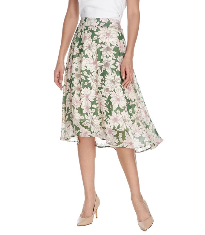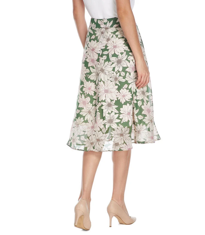 Falda midi Pertegaz de corte A en tejido de punto con estampado floral y medio cierre de cremallera oculto en parte posterior.
