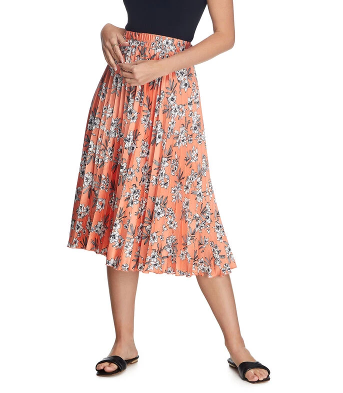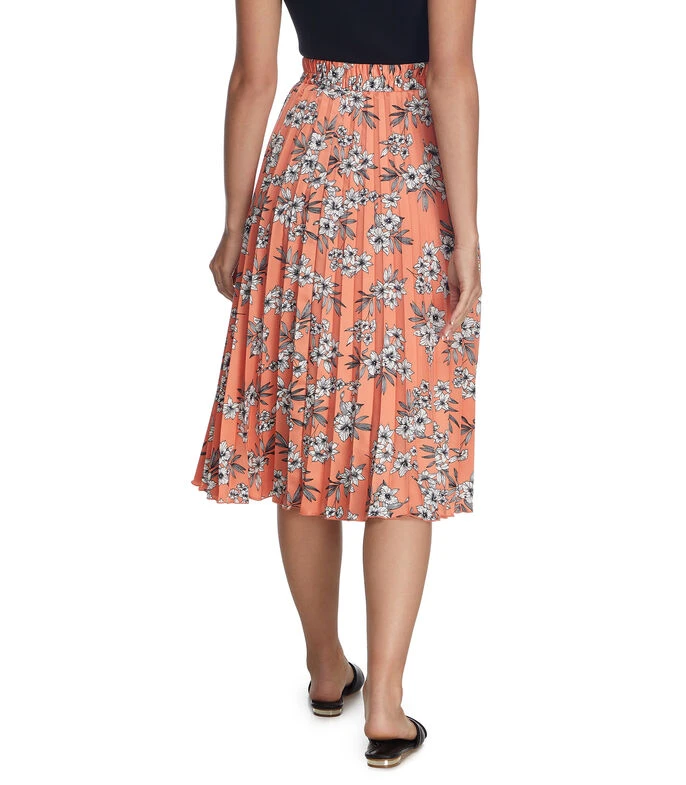 Falda midi Pertegaz de corte «A» en tejido de punto con estampado floral, plisado en cuerpo y pretina elástica.