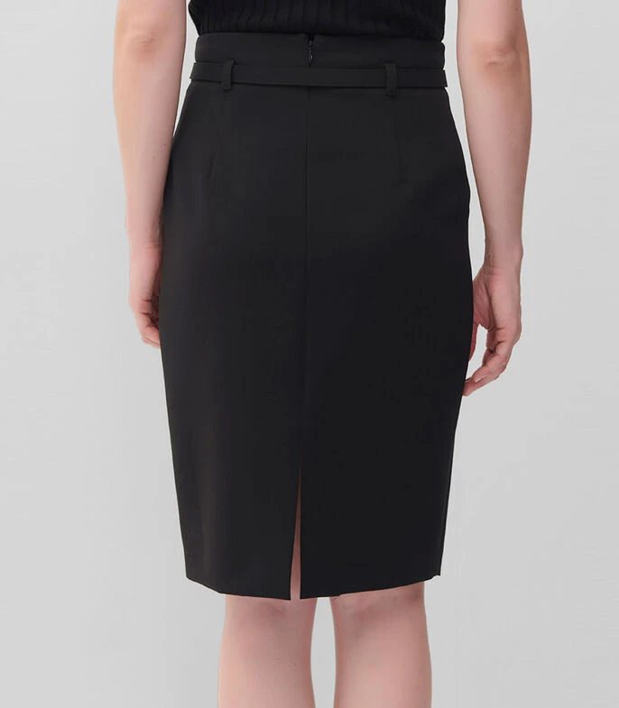 Falda Julio midi de corte recto; en tejido de punto liso con cinturón de hebilla metálica, costuras decorativas, cremallera discreta y abertura en parte posterior. Ya sea para una ocasión especial o simplemente para destacar en tu día a día, la Falda Julio es la elección ideal.