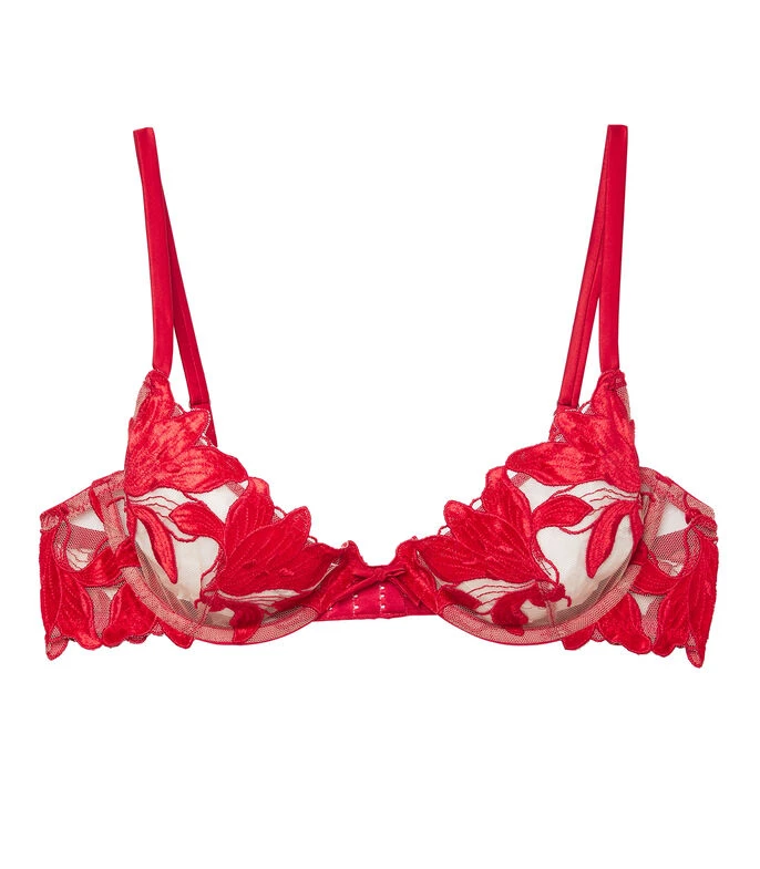 Brasier Fleur du Mal en tejido de punto semi transparente con bordado floral de media copa, tirantes ajustables y broche posterior.