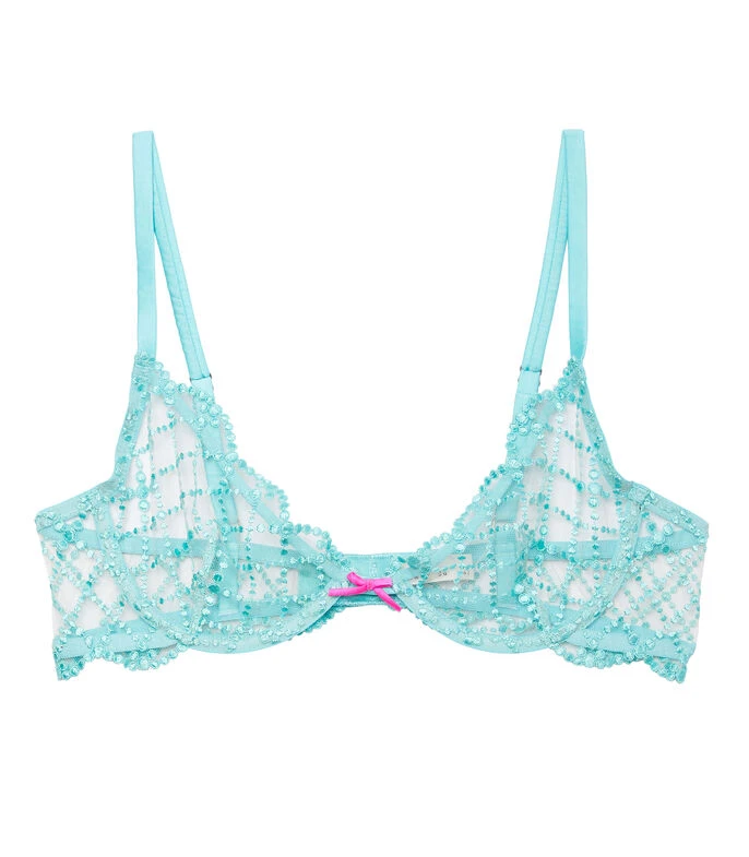 Brasier Fleur du Mal Dotty Grid; en tejido de punto semitransparente con sutiles aplicaciones tipo encaje, tirantes delgados y broche ajustable en espalda.