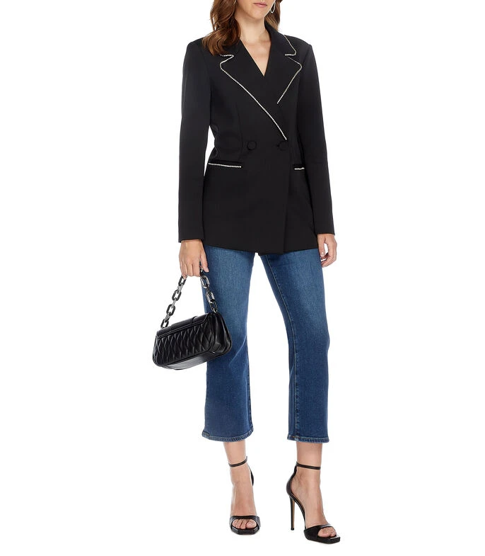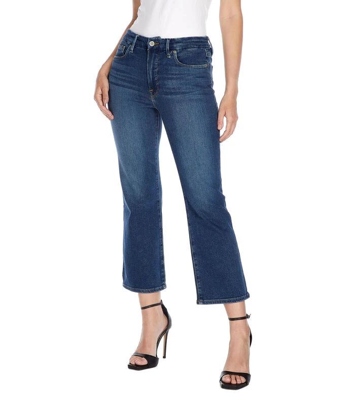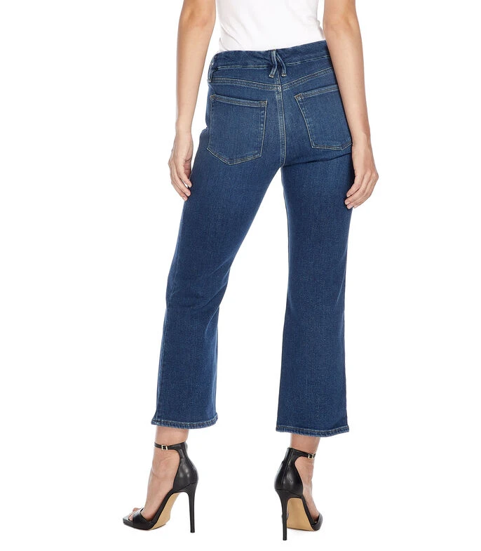 Jeans Good American de corte bootcut en sutil deslavado con bragueta de cierre, costuras a contraste y bolsillos.
