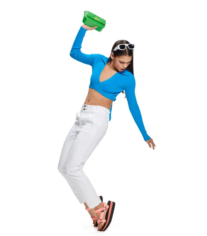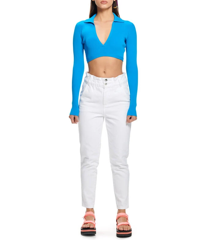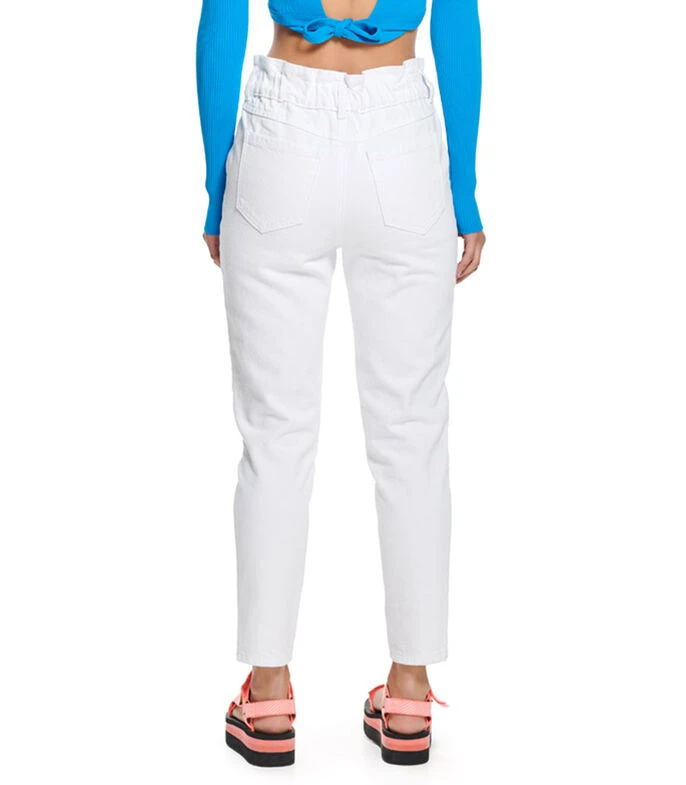 Jeans Unfollow de corte recto tipo paperbag, diseño sólido, cintura elástica, trabillas, bolsillos diagonales y cierre de cremallera con botones frontal.